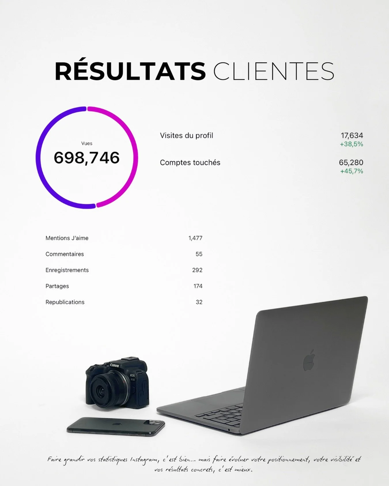 Chaque projet est unique, mais nos clients constatent généralement une augmentation de leur visibilité, un meilleur engagement, et une croissance accrue de leur clientèle et leur ÇA grâce à une bonne stratégie.